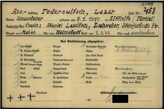 Der International Tracing Service, also der Suchdienst der alliierten Befreier - und nicht der des Roten Kreuzes -, verfügte am 5.7.1951 zu Lazar Todorowitsch, geboren 5.1.1910 in Sittnitz, Gefangenen-Nummer 458 im „KL. Niederhagen-Wewelsburg“, nicht nur über sechs Dokumente. Der ITS abgekürzte Suchdienst der Alliierten gibt zwar im Umschlag nur die o.a. „Effektenkarte”, zwei „Todesmeldungen”, zwei „Sterbeurkunden” und die oben erwähnte „Korrespondenz” an,