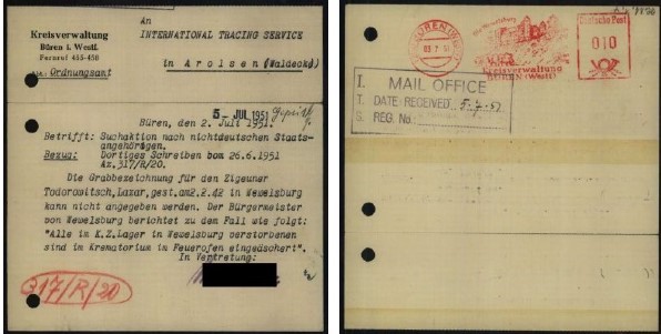 „Die Grabbezeichnung für den Zigeuner Todorowitsch, Lazar, gestorben am 2.2.42 in Wewelsburg kann nicht angegeben werden. Der Bürgermeister von Wewelsburg berichtet zu dem Fall wie folgt: ,Alle im K.Z.Lager in Wewelsburg verstorbenen sind im Krematorium im Feuerofen eingeäschert‘. In Vertretung: (Unterschrift) [Dick und fett umkreist in rot:] 317/R/20“