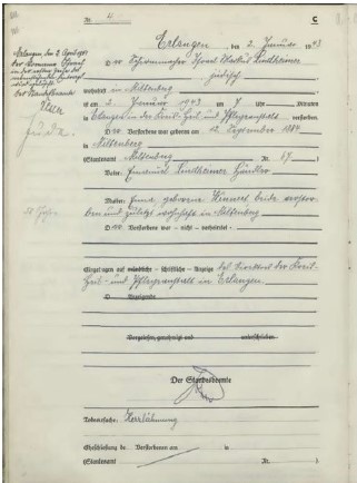 Der Grund dafür ist unser Bezug zur ehemaligen Geschichte des Bauwerks, in dem nach unserem Wissen mindestens ein Jude im Zusammenhang mit der sogen. ,Euthanasie‘ gestorben ist. Es handelte sich um Markus Lindheimer aus Miltenberg, der am 31. Juli 1941 von der Pflegeanstalt Gremsdorf her nach Erlangen gebracht wurde. Er starb mit 58 Jahren am 2. Januar 1943 in der Station H1, wohin er am 18. Februar 1942 ,aus organisatorischen Gründen verlegt werden (musste)‘, wie es in seiner Patientenakte heißt. H1 befand sich im Souterrain des östlichen Patiententrakts. Genau hier setzte man also die Patienten dem aus, was in der Fachforschung als ,strukturelle Unterversorgung‘ bezeichnet wird. …