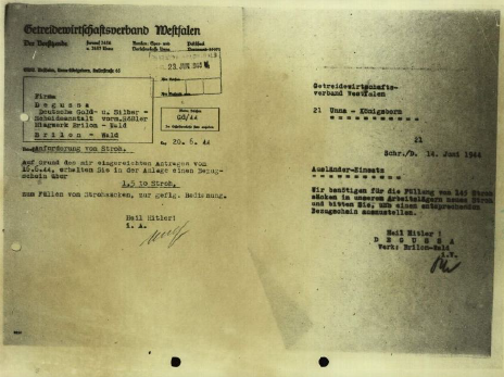 Diesem Brief des Getreidewirtschaftsverband Westfalen an die „Degussa, Deutsche Gold- u. Silber-Scheideanstalt, vorm. Rößler, Hiagwerk Brilon-Wald“ vom 20.6.1944, den ich weiter unten abtippe, gingen viele andere voraus. Er befindet sich ITS, Teilbestand 2.2.0.1; manche Firmen haben einen eigenen Ordner: